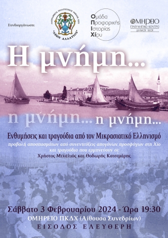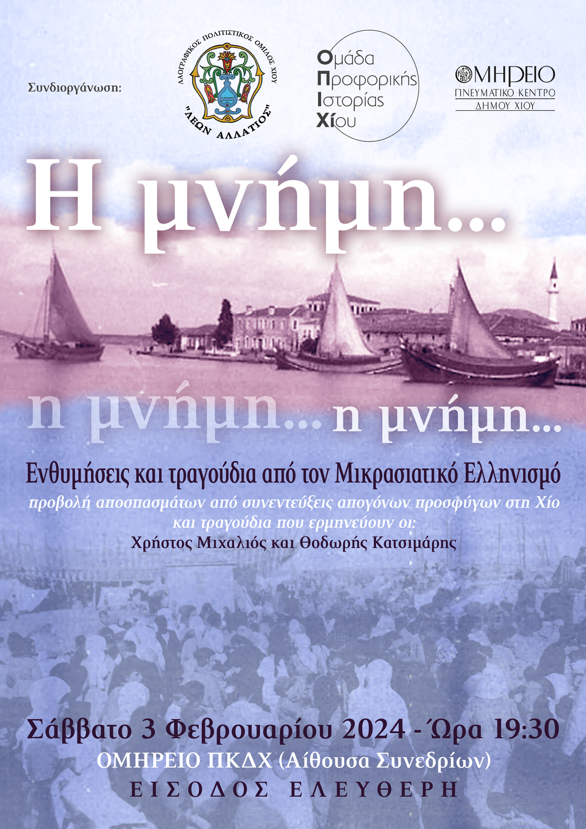 Ο Λαογραφικός Πολιτιστικός Όμιλος Χίου "Λέων Αλλάτιος" και η Ομάδα Προφορικής Ιστορίας Χίου (ΟΠΙΧΙ) συνδιοργανώνουν την εκδήλωση "Η Μνήμη, η μνήμη, η μνήμη: Ενθυμήσεις και τραγούδια από τον Μικρασιατικό Ελληνισμό". Η εκδήλωση περιλαμβάνει βιντεοσκοπημένες αφηγήσεις που έχουν δώσει σε μέλη της ΟΠΙΧΙ απόγονοι προσφύγων από την Χερσόνησο της Ερυθραίας.