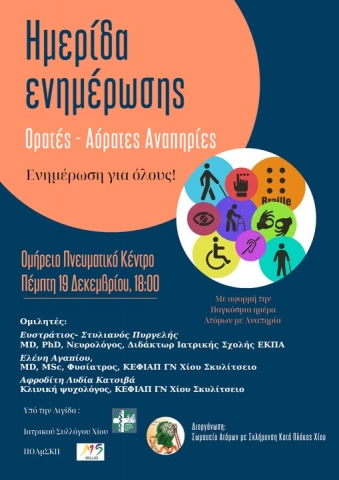 Το Σωματείο Ατόμων με Πολλαπλή Σκλήρυνση Χίου, οργανώνει μία σημαντική ημερίδα με θέμα "Ορατές-Αόρατες Αναπηρίες" Σκοπός τους να ενημερώσουν και να ευαισθητοποιήσουν τους πολίτες σχετικά με το σοβαρό θέμα της αναπηρίας λαμβάνοντας ως αφορμή τη Παγκόσμια Ημέρα Ατόμων με Αναπηρία που τιμάται 3 Δεκεμβρίου κάθε έτους.