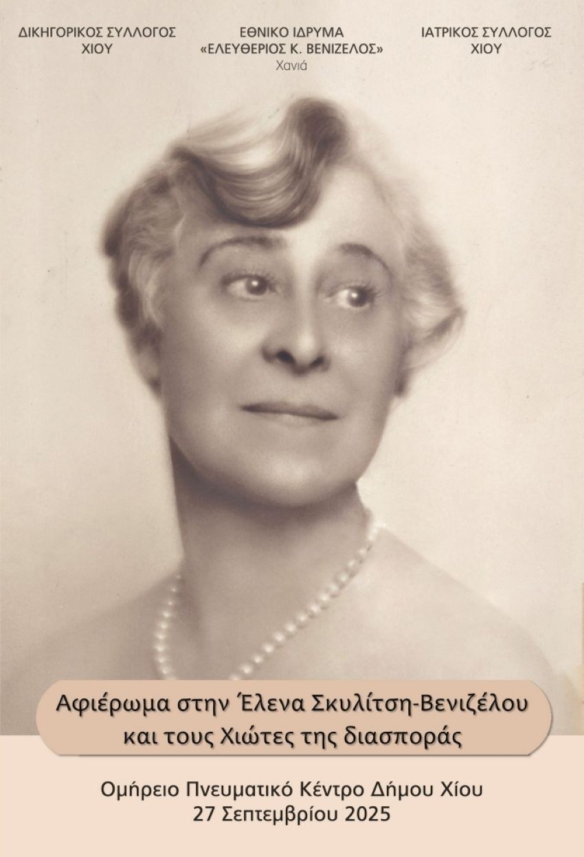 Το Σάββατο 27 Σεπτεβρίου 2025 ο Δικηγορικός Σύλλογος Χίου, το Εθνικό Ίδρυμα "Ελευθέριος Βενιζέλος" και ο Ιατρικός Σύλλογος Χίου σας προσκαλούν στην εκδήλωση "Αφιέρωμα στην Έλενα Σκυλίτση-Βενιζέλου και στους Χιώτες της διασποράς¨.