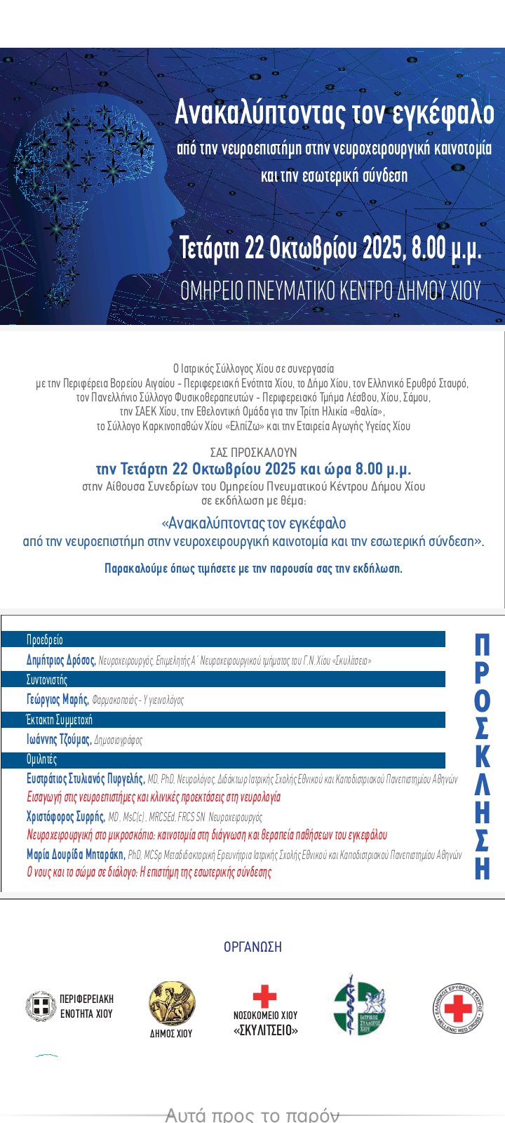 Ο Ιατρικός Σύλλογος Χίου σε συνεργασία με την Περιφέρεια Βορείου Αιγαίου-Περιφερειακή Ενότητα Χίου, το Δήμο Χίου, τον Ελληνικό Ερυθρό Σταυρό σας προσκαλούν σε εκδήλωση με θέμα: "Ανακαλύπτοντας τον εγκέφαλο από την νευροεπιστήμη στην νευροχειρουργική καινοτομία και την εσωτερική σύνδεση". Ομιλητές: 1) κ. Ευστράτιος Πυργελής, Νευρολόγος, Διδάκτωρ Ιατρικής Σχολής ΕΚΠΑ, 2) κ. Χριστόφορος Συρρής, Νευροχειρουργός, 3) κα Μαρία Δουρίδα-Μηταράκη, Μεταδιδακτορική Ερευνήτρια Ιατρικής Σχολής ΕΚΠΑ.