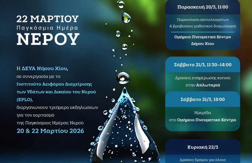 Η ΔΕΥΑ Νήσου Χίου σε συνεργασία με τι Ινστιτούτο Αειφόρου Διαχείρισης των Υδάτων και Δικαίου του Νερού (EPLO) διοργανώνει τριήμερο εορταστικών εκδηλώσεων από τις 20-22/03/2026. Το Σάββατο 21/03/2026 θα πραγματοποιηθεί ημερίδα για το νερό. Η συγκεκριμένη πρωτοβουλία εντάσσεται στα πλαίσια του προγράμματος με τίτλο: "Δράσεις ευαισθητοποίησης και εκπαίδευσης του πληθυσμού της Χίου για το πρόβλημα της Ύδρευσης και της Λειψυδρίας στη Νήσο Χίο και στρατηγικές αντιμετώπισης του προβλήματος".