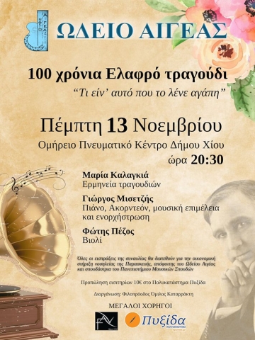 Μια μουσική αναδρομή στα 100 χρόνια του Ελληνικού Ελαφρού Τραγουδιού από το Ωδείο Αιγέας με τίτλο: "Τι είν' αυτό που το λένε αγάπη".