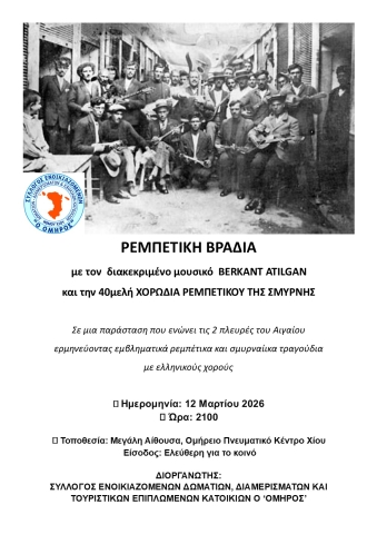 Ο Σύλλογος Ενοικιαζομένων Δωματίων, Διαμερισμάτων και Τουριστικών Επιπλωμένων Κατοικίων Χίου "Ο Όμηρος" σας προσκαλεί σε μια μοναδική ρεμπέτικη βραδιά - αφιέρωμα στην κοινή πολιτιστική κληρονομιά του Αιγαίου. Με τον διακεκριμένο μουσικό και μαέστρο Berkant Atilgan και την 40μελή Χορωδιά Ρεμπέτικου της Σμύρνης, σε μια παράσταση που ενώνει τις δύο πλευρές του Αιγαίου ερμηνεύοντας εμβληματικά ρεμπέτικα και σμυρναίικα τραγούδια με ελληνικούς χορούς θυμίζοντας μας τις κοινές πολιτιστικές ρίζες των δύο λαών.