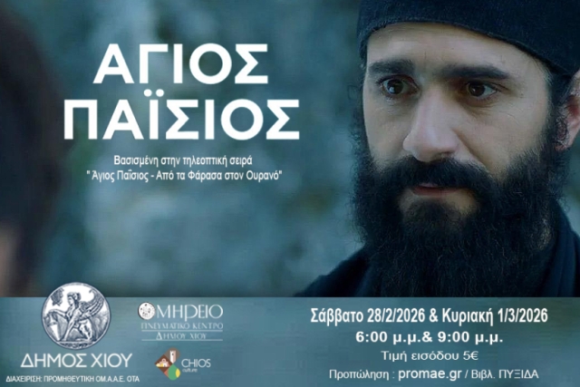 Προβολή της ταινίας "'Αγιος Παϊσιος" σε σκηνοθεσία Στάμου Τσάμη. ΕΛΛΑΔΑ/ΕΓΧΡΩΜΗ/2026/ΔΡΑΜΑ ΙΣΤΟΡΙΑ/125'. Θα πραγματοποιηθούν δύο προβολές μιά στις 18:00 & 21:00.