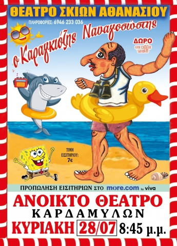 Το Θέατρο Σκιών του Γιώργου Αθανασίου παρουσιάζει τη περιπέτεια του αγαπημένου μας Καραγκιόζη με τίτλο "Ο ΚΑΡΑΓΚΙΟΖΗΣ ΝΑΥΑΓΟΣΩΣΤΗΣ"