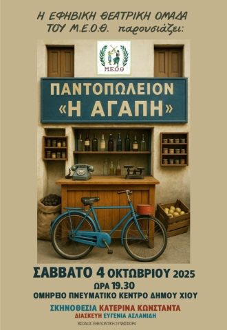 Η Εφηβική θεατρική ομάδα του ΜΕΟΘ παρουσιάζει την θεατρική παράσταση με τίτλο "Παντοπωλείον η αγάπη" σε διασκευή Ευγενίας Ασλανίδη και σε σκηνοθεσία Κατερίνας Κωνσταντά.