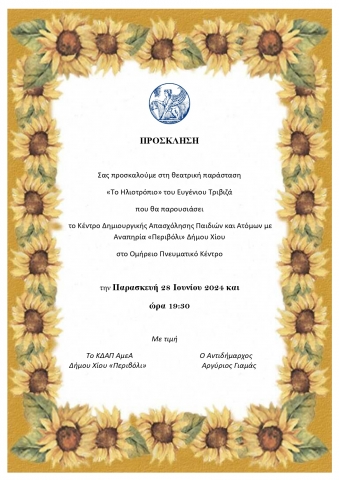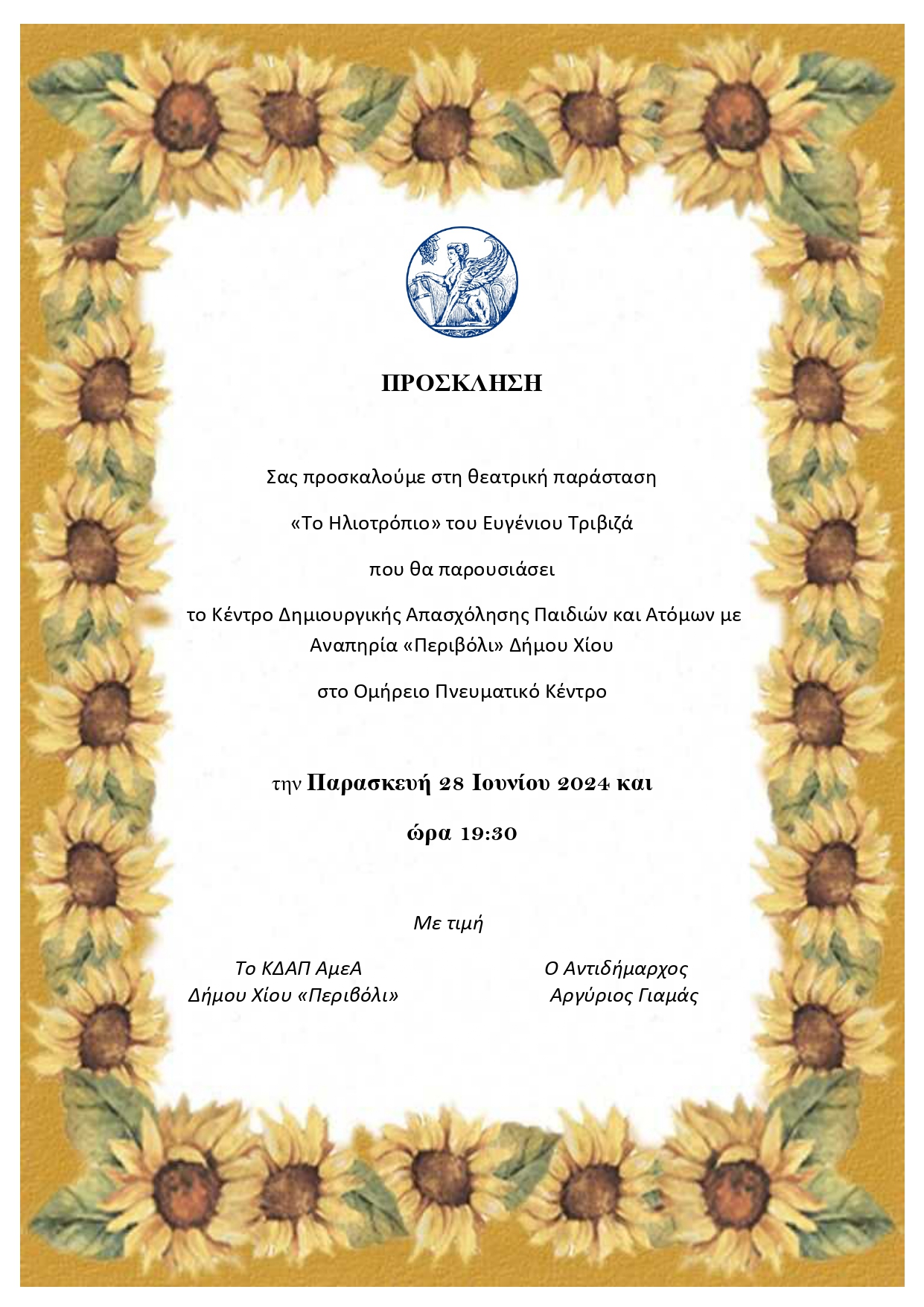 Μία από τις εκπλήξεις του φετινού Πολιτιστικού Καλοκαιριού του Δήμου Χίου είναι ότι το έργο "Όρνιθες" του Αριστοφάνη σε σκηνοθεσία Άρη Μπινιάρη πριν την επίσημη πρεμιέρα τους στη Επίδαυρο στα πλαίσια του Φεστιβάλ Αθηνών έρχονται στη Χίο στο όμορφο χωριό Καρδάμυλα!!!