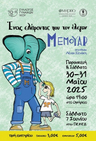 Η θεατρική ομάδα του Συλλόγου Γυναικών Χίου παρουσιάζει την παιδική παράσταση με τίτλο "Ένας ελέφαντας που τον έλεγαν μεμουάρ" σε σκηνοθεσία - κείμενα Λένιας Ξενάκη.
