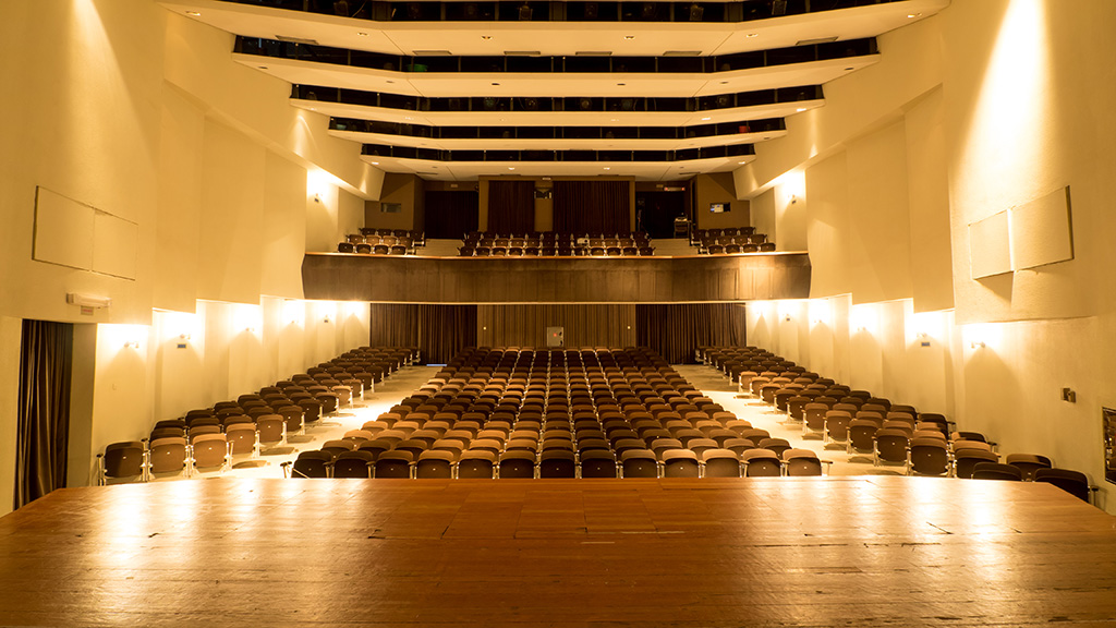 Με 450 θέσεις, υπερώο και χώρο ορχήστρας, έκτακτη ακουστική και ορατότητα, σύγχρονες σκηνικές εγκαταστάσεις, με καμαρίνια ηθοποιών και εργαστήρι σκηνικών. Έχει κινηματογράφο με πανοραμική οθόνη μεγάλων διαστάσεων, μηχάνημα προβολής ταινιών ψηφιακής τεχνολογίας, κινηματογραφικό προβολέα, DVD/BlueRay Player και πιάνο "STEINWAY". Η αίθουσα εξυπηρετείται από ένα χωλ-φουαγιέ έκτασης 300 τ.μ. και ένα κυλικείο στον Α' όροφο.